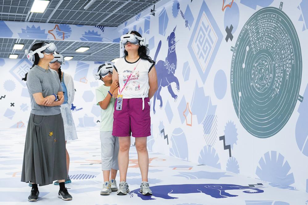 ↓ 7月10日,观众在南京博物院体验VR展。 当日,南京博物院“观天下·坤舆万国全图”VR大空间沉浸展正式开展。展览以南京博物院明代中文版世界地图《坤舆万国全图》为主线,通过720°全景沉浸式、4K超清画质、大空间交互的VR数字形式,故事化、视觉化、沉浸式呈现明代历史背景下的水韵江苏、中西交流,吸引众多观众前来参观。新华社记者 李博 摄