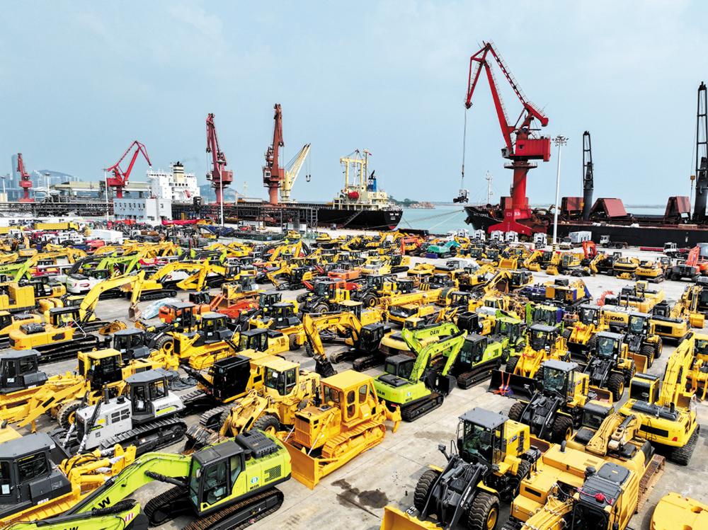 7月13日,在江苏省连云港港东方港务分公司码头,大批出口机械集港等待装船(无人机照片)。 记者从2025年中国航海日主论坛获悉,我国拥有全球规模最大的海运船队,建成了全球最大的世界级港口群,国际海运量占全球近三分之一,海洋经济总量持续攀升,为全球经贸持续稳定发展注入了强劲动力。 新华社发 王春 摄