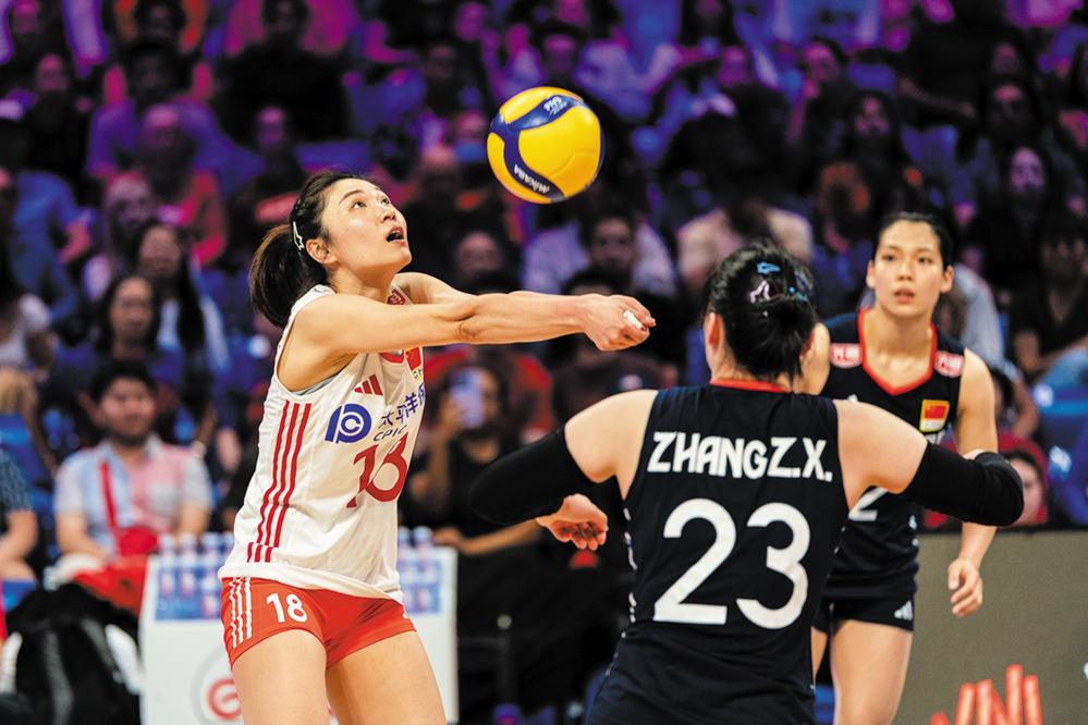7月13日,中国队球员王梦洁(左)在比赛中防守。 当日,在美国得州阿灵顿举行的2025世界女排联赛分站赛中,中国队3比2战胜美国队。 新华社发(陈晨 摄)