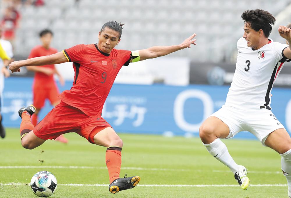 7月15日,中国队球员张玉宁(左)在比赛中射门。 当日,在韩国龙仁举行的2025年东亚足联E-1足球锦标赛(东亚杯)男足第三轮比赛中,中国队1比0战胜中国香港队。 新华社记者 姚琪琳 摄