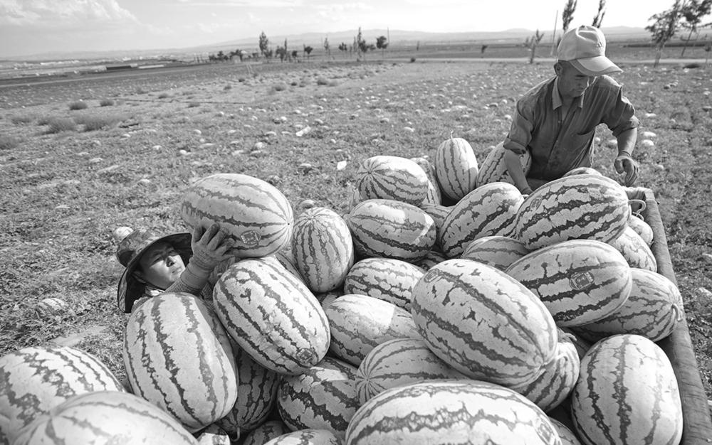 7月20日,农户在中卫市沙坡头区兴仁镇采摘、转运硒砂瓜。 盛夏时节,宁夏中卫市沙坡头区数十万亩硒砂瓜正式开园上市,在环香山核心产区,瓜农们抢抓农时采摘硒砂瓜。得益于当地干旱气候和富硒砂壤,戈壁滩产出的硒砂瓜以“个大、瓤沙、汁多、甜度高”著称,被誉为戈壁“绿宝石”。 据了解,宁夏中卫市今年硒砂瓜种植面积46.95万亩,预计产量将达115万吨,硒砂瓜产业已成为当地农户增收致富的支柱产业。 新华社记者 王鹏 摄