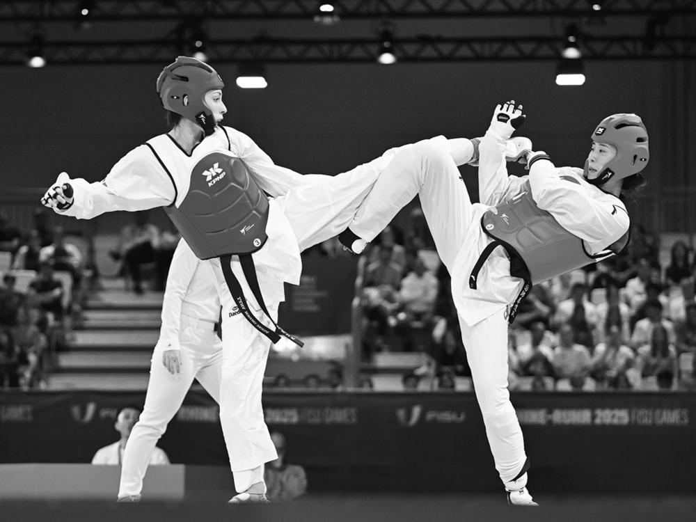7月20日,中国选手邢佳妮(右)在比赛中。 当日,在德国埃森举行的2025年莱茵—鲁尔世界大学生夏季运动会跆拳道女子67公斤级决赛中,中国选手邢佳妮战胜西班牙选手莫雷诺·雷耶丝,获得冠军。 新华社记者 连漪 摄