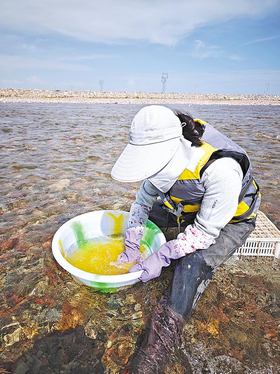 采集孵化鱼卵就是一场与时间的赛跑,每年洄游季在河道采集时,工作人员要用轻巧的手法将雌鱼的鱼卵缓缓挤出,并及时加入雄鱼的精液,用羽毛轻柔地搅拌完成受精。“最多的时候,这样的工作一天要重复上千次,能采集130余万枚鱼卵。”江华敏说。
