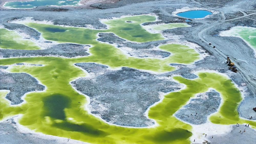 记者看到景区内的网红打卡点上排起长队,游客们或驻足湖中拍摄倒影,或沿着木栈道远眺盐湖群的壮阔。