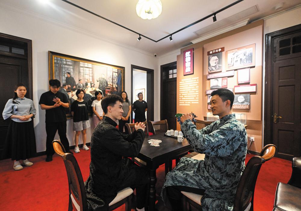 观众在吉鸿昌旧居观看演员表演(8月16日摄)。 今年以来,位于天津市和平区的吉鸿昌旧居推出沉浸式展演《国魂》,演员以整栋旧居为舞台,通过在不同展室里实景演绎“赠碗共勉”“光荣入党”“不幸被捕”“英勇就义”四个片段,把吉鸿昌将军的英雄事迹与旧居历史场景融合再现,让观众更好地感受其爱国情怀与理想信念。新华社记者 赵子硕 摄