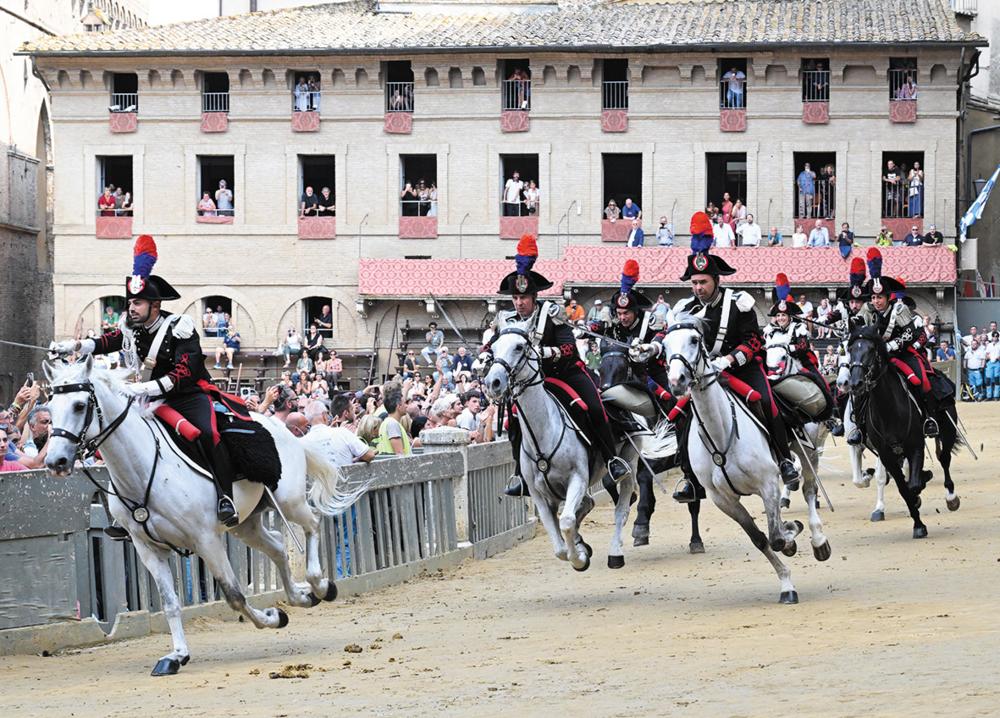 8月16日,在意大利锡耶纳,意大利宪兵在赛马节上表演。 当日,锡耶纳赛马节在意大利托斯卡纳大区古城锡耶纳举行。锡耶纳赛马节是世界闻名的意大利传统民间活动,始于1656年,每年7月和8月举行。 新华社发 (阿尔贝托·林格利亚 摄)