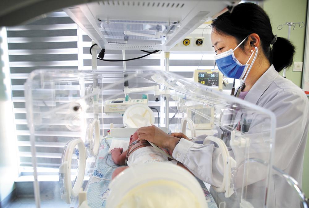 8月18日,在江苏省连云港市立东方医院新生儿科,医师给新生儿听诊。 新华社发(王春 摄)