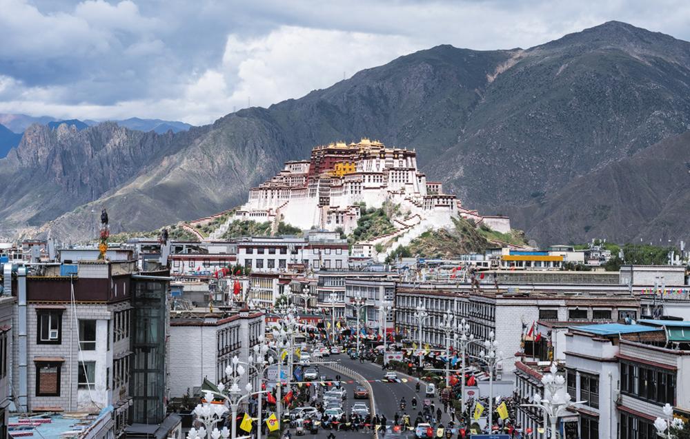 这是8月19日拍摄的拉萨市街景。 在庆祝西藏自治区成立60周年之际,拉萨街头张灯结彩,处处洋溢着喜庆氛围。 新华社记者 丁增尼达 摄