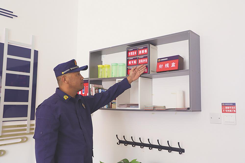 在消防队营房一楼,有间24小时开放的便民室。记者到访时,几位采摘工刚接了开水离开。“这里还备有针线、简单医疗用品,希望能帮助到有需要的人。”桑永锋介绍道。明亮的休息室里摆放着几张沙发,“去年有位北京游客刚开始住在消防队门口,说是觉得安全。我赶紧把他们安排到这里住了一晚,后来他们还从北京寄来了锦旗。”