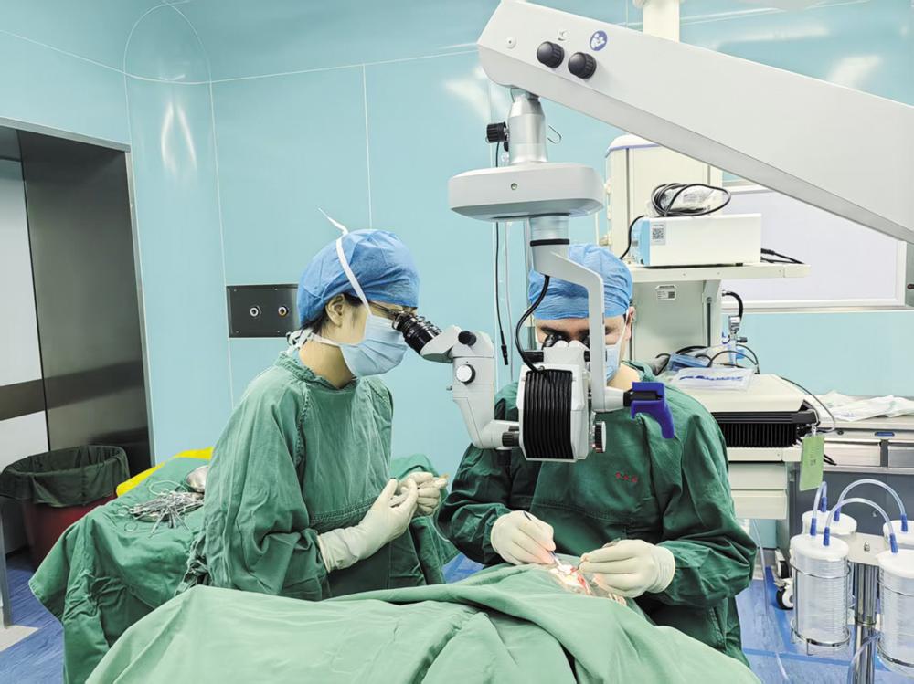 手术从21时30分正式开始。术中,刘辉手持显微器械,在眼球创口上精准操作:先仔细清除创口周围的污染物和凝血块,避免感染风险;再小心翼翼地将脱出葡萄膜组织轻柔复位,确保眼内组织不受二次损伤;最后用缝线对破损的眼球壁进行分层缝合,每一针的间距、深度都控制在毫米级。整个过程中,团队成员密切配合,手术室内只听见器械轻微的碰撞声和医护人员的低声交流。经过1个半小时的紧张奋战,手术顺利结束。
