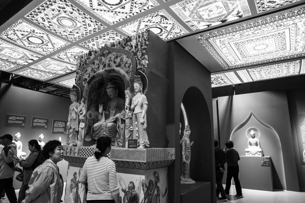 9月22日,游客在参观敦煌文博会上的展览。 9月20日至22日,第八届丝绸之路(敦煌)国际文化博览会在甘肃省敦煌市举行。敦煌研究院“典范”“高地”建设成果展、甘肃文旅非遗文创展、敦煌·丝路雕塑展等多项展览同步亮相,集中展现了敦煌文化遗产保护、研究、弘扬的最新成果以及共建“一带一路”国家的文化艺术、非遗文创、风土人情等精彩内容。 新华社记者 郎兵兵 摄
