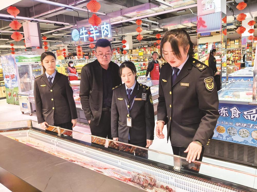 “越是过节,越要绷紧安全这根弦。”上午时分,好好爱家购物中心内人声鼎沸,年味十足。货架上,米面油、糖果礼盒、生鲜果蔬一应俱全,购物的群众推着购物车穿梭其间,脸上洋溢着喜悦。乌兰县市场监管局的执法人员马吉萍、史重月和同事们拎着检查包,径直走向生鲜区——这里是群众“菜篮子”的核心阵地,也是此次节前专项检查的重中之重。