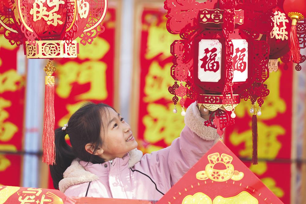 2月13日,在山东省临沂市郯城县郯城街道年货市场,小朋友在选购春节饰品。 新春佳节临近,各地群众赶大集、备年货、迎春节。 新华社发(张春雷 摄)
