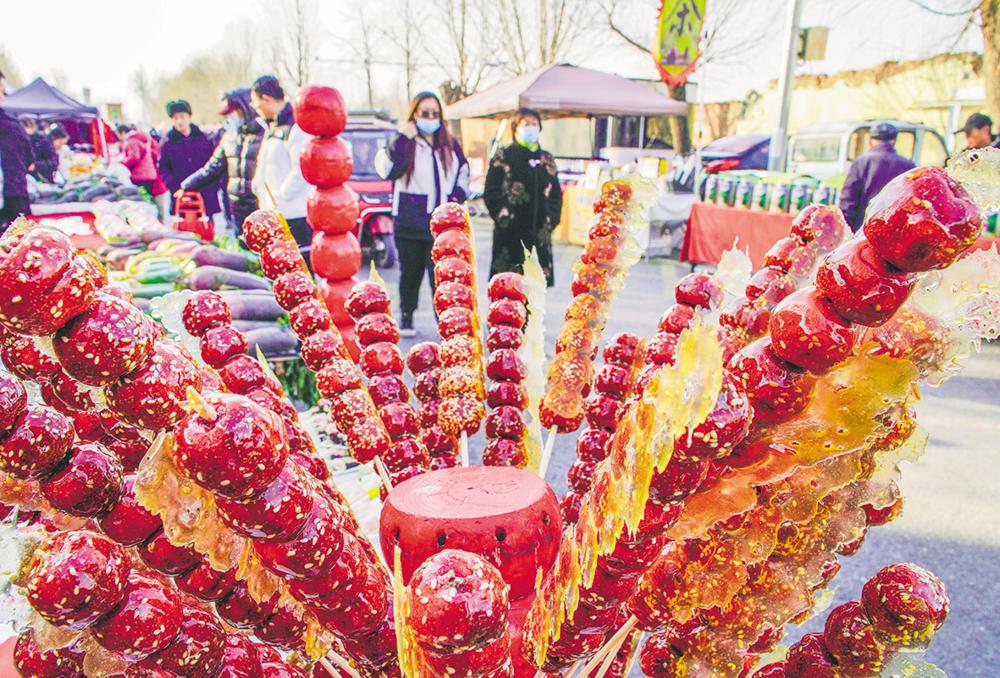 ← 2月12日,人们在北京市平谷区南独乐河镇大集购买年货。 新华社发(刘满仓 摄)
