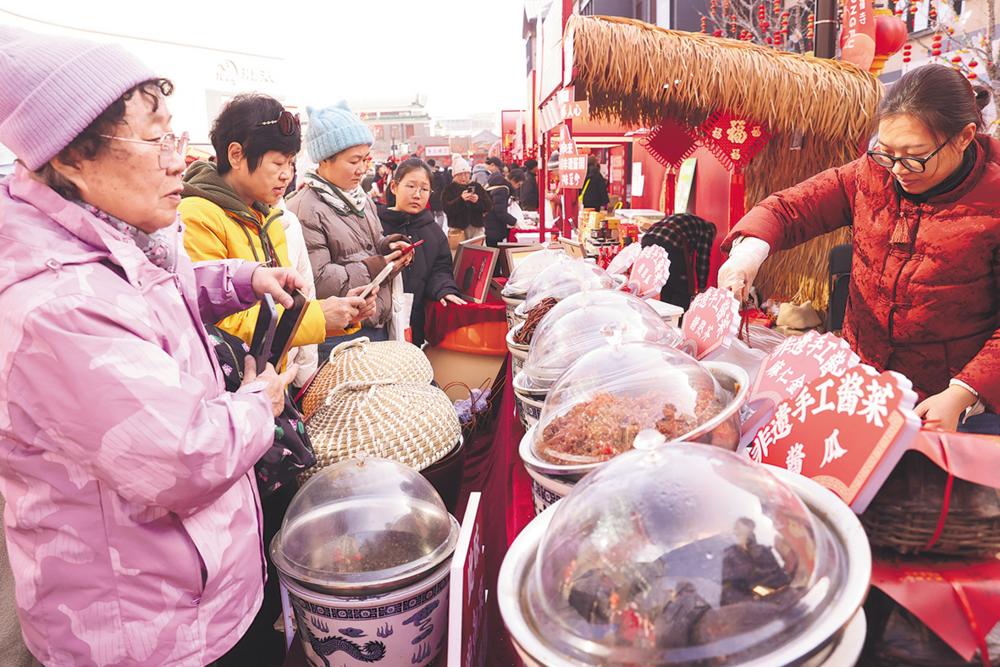 ← 2月13日,消费者在北京市隆福寺六必居摊位购买咸菜。 新华社发(陈晓根 摄)
