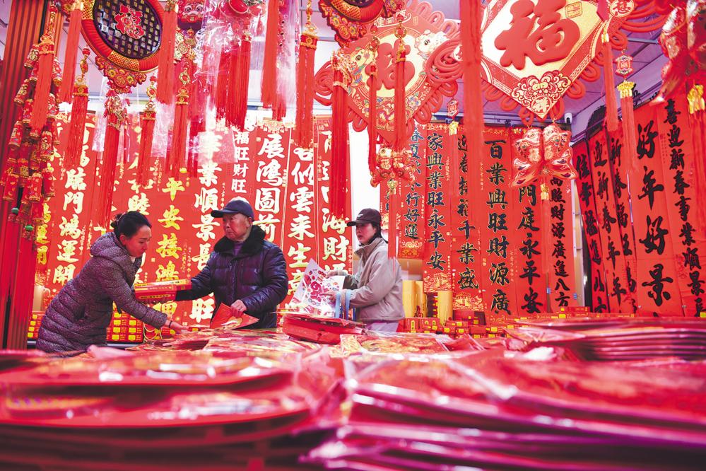 ↑2月13日,市民在浙江省建德市更楼街道年货一条街选购新春饰品。 新华社发(宁文武 摄)