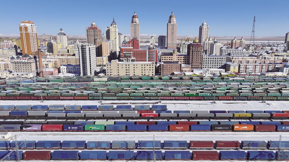 2月26日,中欧班列在中国铁路哈尔滨局集团有限公司满洲里站等待出境发车(无人机照片)。 截至2月26日,2026年以来经中欧班列东通道进出境的中欧班列总数达1034列,运输货物105170标箱,较2025年提前26天突破1000列大关。 中欧班列东通道由满洲里、绥芬河、同江铁路口岸组成,目前有27条班列通行线路,覆盖波兰、德国、荷兰等14个国家,联通国内长沙、郑州、成都等60余个城市。新华社发(黄旭 摄)