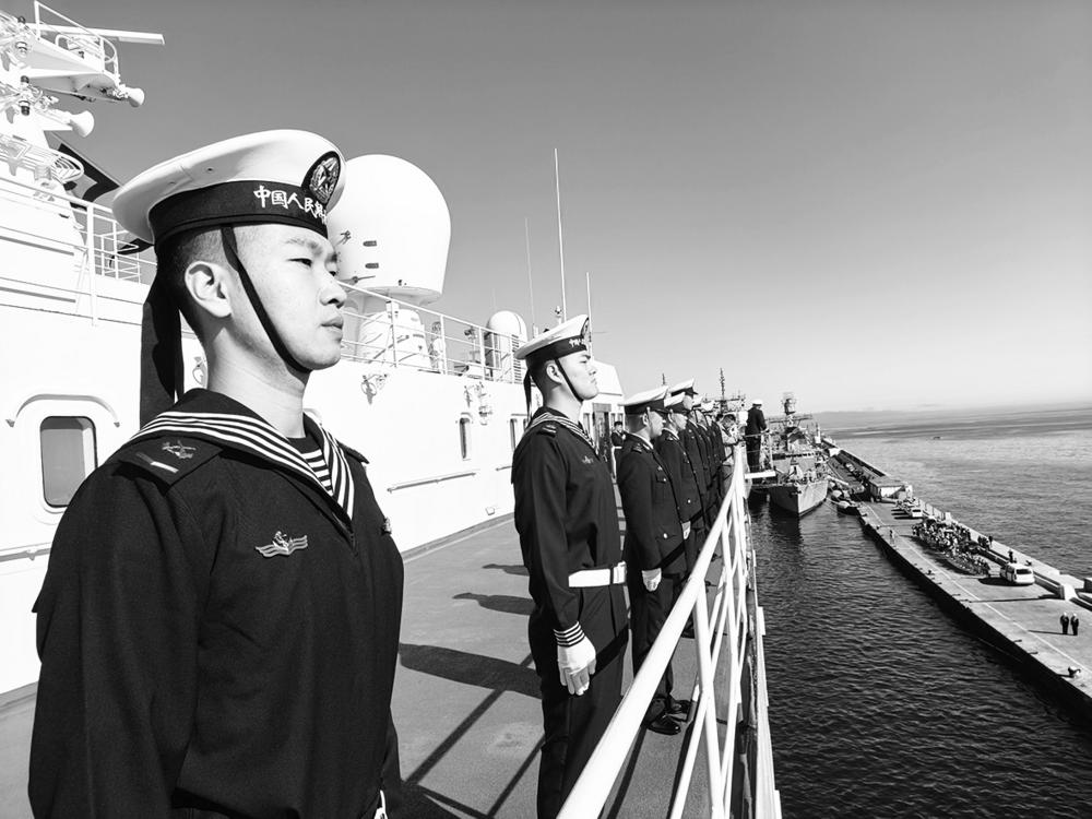 3月1日,执行“和谐使命-2025”任务的中国海军“丝路方舟”号医院船抵达智利瓦尔帕莱索港,医院船官兵分区列队。新华社发(崔晓洋 摄)