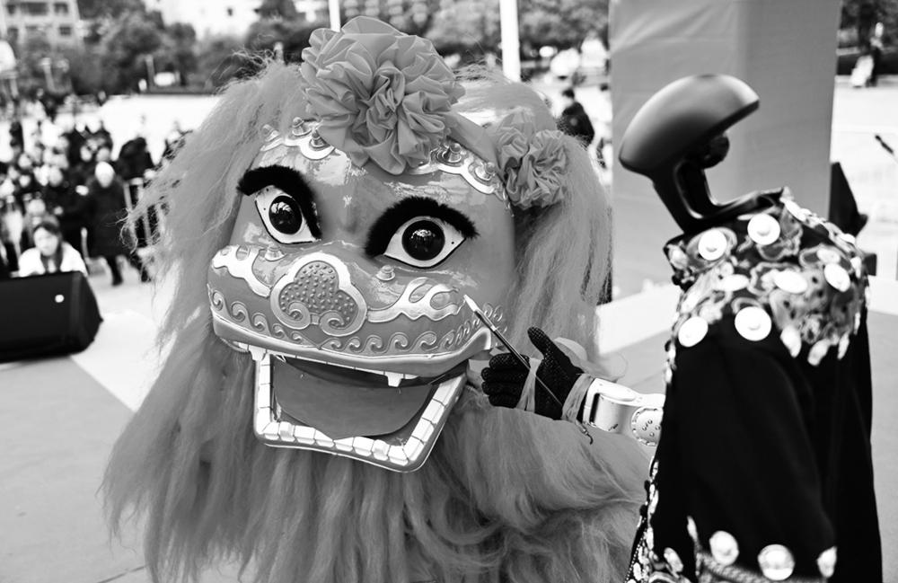 3月2日,在湖北省宣恩县人民广场,演员舞狮子与机器人进行互动。 元宵节将至,各地举办丰富多彩的活动,喜迎佳节。新华社发(宋文 摄)