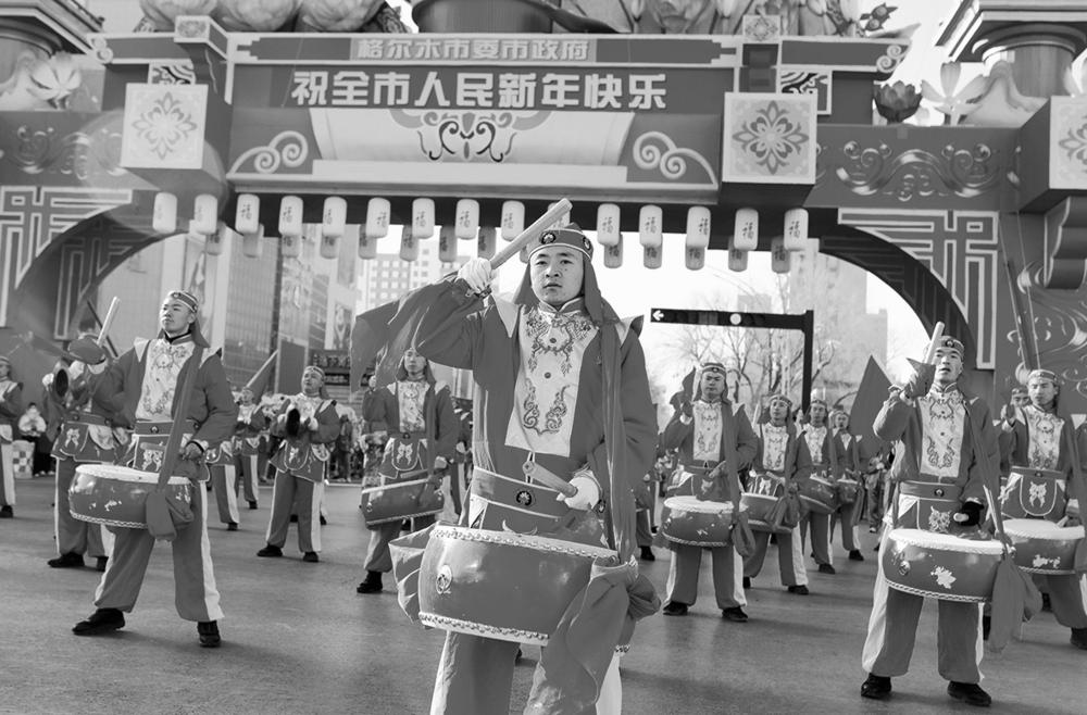 春日的格尔木,昆仑山下春风和煦,一大早,八一路与昆仑路十字的表演现场已人头攒动,八方群众欢聚一堂,共庆元宵佳节。暖场表演《吉祥鼓乐・昆仑雄风》率先擂响序幕,铿锵鼓点震天动地,雄浑节奏气势如虹,奏响昆仑大地的昂扬气魄,拉开整场社火展演的恢宏序幕。