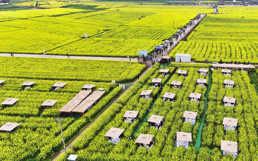 游客在四川省南充市蓬安县睦坝镇武胜村油菜花田里体验“花田席”(3月13日摄,无人机照片)。 春回大地,四川各地的油菜花次第盛开,人们纷纷走进田野,徜徉在金色花海中,亲近自然,感受春的气息。近年来,四川各地紧扣“花经济”,不断完善生态旅游休闲目的地的服务设施,围绕赏花主题推动农业与旅游深度融合,丰富了春日文旅供给,也激发了乡村消费新活力。 新华社发(刘永红 摄)
