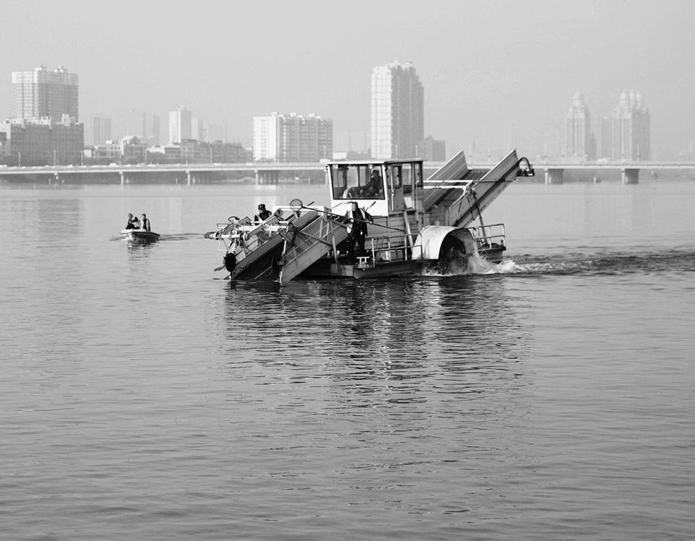 3月22日,在河南省南阳市白河槐香湾水域,工人驾驶大型清漂割草船在河面上清理水草。 3月22日是第三十四届“世界水日”。3月22日至28日是第三十九届“中国水周”。各地举行丰富多样的主题活动,增强人们的节水护水意识。 新华社发(高嵩 摄)