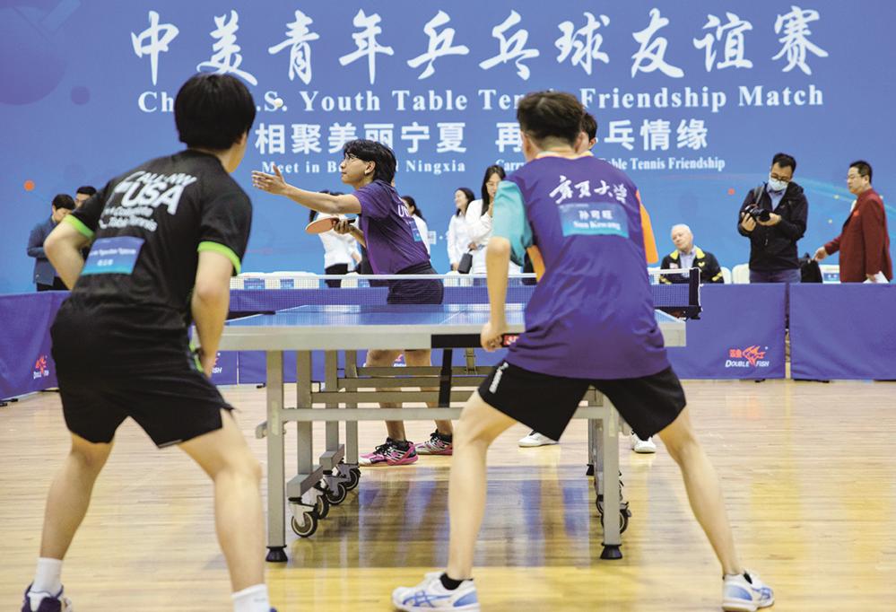 4月16日在宁夏体育馆拍摄的中美青年乒乓球友谊赛。 4月16日,中美青年乒乓球友谊赛在宁夏体育馆举行,两国青年运动员以球会友、切磋技艺,展现了昂扬向上的青春风貌。 新华社记者 杨植森 摄