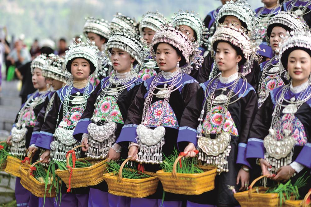 4月19日,侗族姑娘在贵州省镇远县报京侗寨参加“三月三”讨葱定情活动。 4月18日至21日,第四十一届报京“三月三”民俗文化节活动在贵州省镇远县报京侗寨举行,通过非遗巡游、讨葱定情、侗歌对唱等民俗活动,欢度“三月三”。报京“三月三”是当地侗族传统节日,又名“播种节”,俗称“讨葱节”。 新华社记者 杨文斌 摄