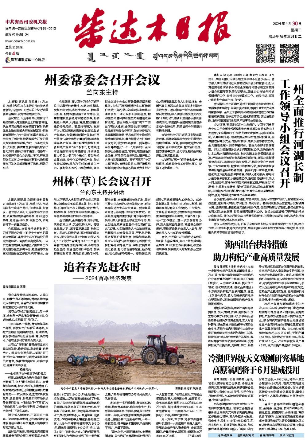 会议强调,要坚定抓好水生态保护。认真学习贯彻党中央关于全面推行河湖长制决策部署及省委省政府相关要求,切实增强守护河湖安澜使命担当,突出问题导向,认真研判形势,准确把握全州河湖管理保护重点,统筹推进保障水安全、管好水资源、守护水生态各项工作,全力建设造福人民的幸福河湖。要全力做好水资源管理。持之以恒推进各类涉水问题整改工作,加快编制柴达木盆地水资源综合规划,制定加强水资源管理具体措施,严格水资源论证审查和取水许可审批,建设水资源管理信息系统,加强实时动态监管,不断深化农业节水增效、工业节水减排、城镇节水降损等行动,推动水资源承载和区域社会经济协调发展。要全面提升水环境质量。强化柴达木盆地生态保护修复,做好大通河源头、布哈河水生态保护修复和水源涵养工作,推进那棱格勒河、柴达木河、沱沱河、察汗乌苏河等河道治理工程,严格落实“河湖长+林草长+检察长+警长”联动机制,深化水环境整治,加强城乡污水治理,着力提升区域生态系统质量和稳定性,更好发挥柴达木盆地生态屏障功能。