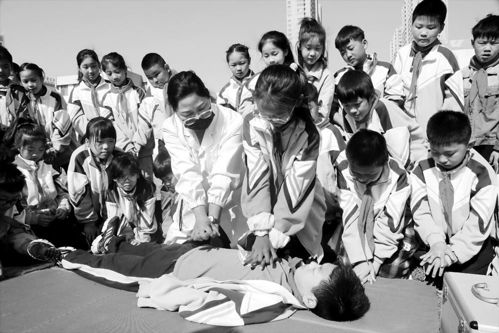5月10日,在江苏省连云港市院前小学举行的“防灾减灾伴我行”主题教育活动中,学生在校医的指导下学习急救方法。 第16个全国防灾减灾日前夕,各地开展形式多样的防灾减灾知识普及和应急疏散演练等活动,提高人们应急避险与安全自救能力。 新华社发(王春 摄)