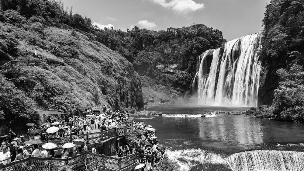 5月4日,游客在贵州省安顺市黄果树瀑布景区游览(无人机照片)。 “五一”假期期间,各地推出丰富多彩的旅游产品供给,加强文旅融合和科技赋能,提升管理水平和服务品质,带动旅游消费欣欣向荣。 新华社发(陈熙 摄)