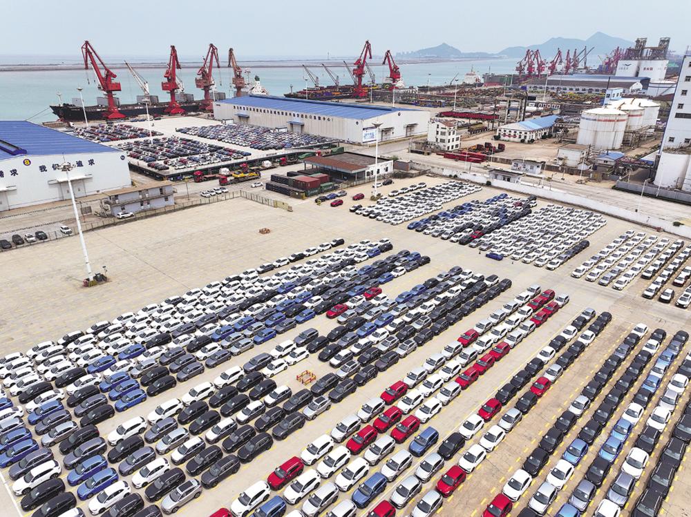 5月13日,在江苏省连云港港东方港务分公司码头,大批轿车集港准备装船出口(无人机照片)。 据5月12日中国汽车工业协会信息,2025年1至4月,我国汽车产销量分别为1017.5万辆和1006万辆,同比分别增长12.9%和10.8%。前4个月产销量首次突破千万辆,彰显汽车产业活力。 新华社发(王春 摄)