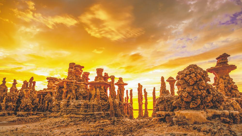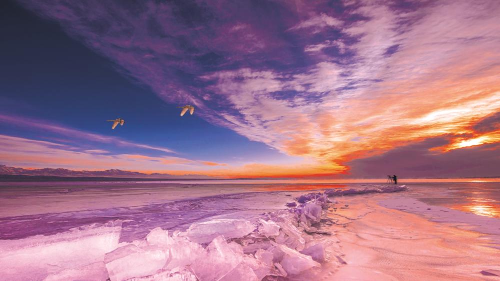 海西的每一寸风光都是大自然亲手绘制的瑰丽画卷——翡翠湖宛如打碎在戈壁滩的碧绿璞玉,澄澈透亮;白公山坐望碧湖,峭壁迎湖屹立;盐湖中盐层洁白如雪,盐花在夕阳折射下熠熠生辉;戈壁滩似无尽的洪荒画布铺展天边,远处落日悬在地平线上,将整片戈壁染成琥珀色……一幅幅光影流转的美景图,恰似海西大地蓬勃生命力的生动注脚。文/本报记者 丁迎香