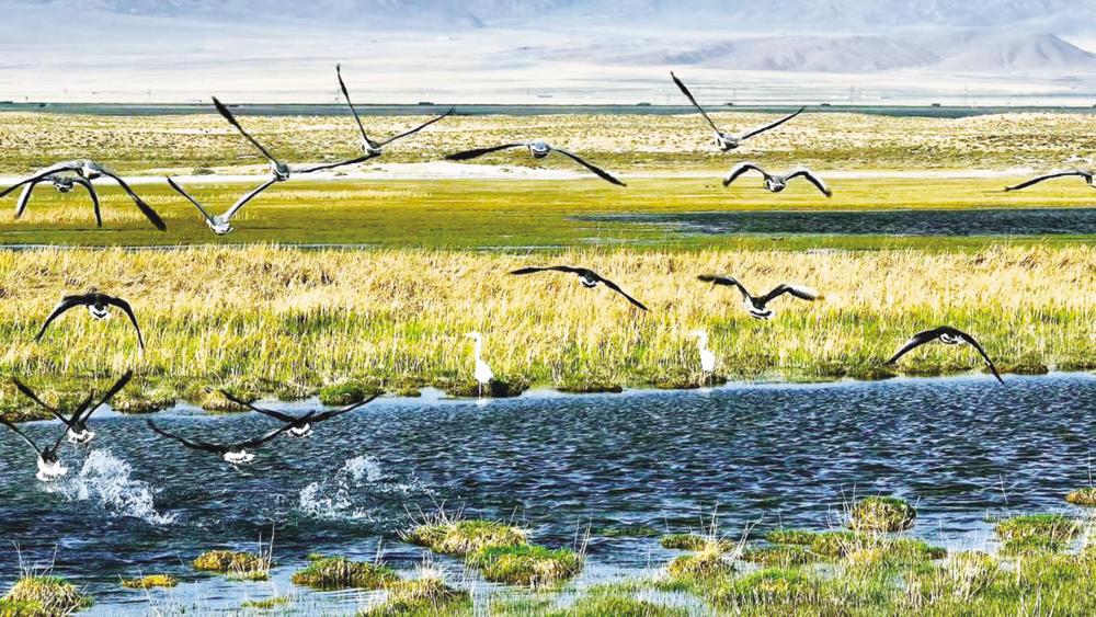乌兰 生态画卷添灵动生机 初夏时节,万物竞荣。近日,笔者在乌兰县茶卡镇湿地拍摄到大白鹭、黑颈鹤、赤麻鸭和灰雁等珍稀鸟类同框画面。两只大白鹭姿态优雅,亭亭玉立;黑颈鹤身姿挺拔,优雅踱步;赤麻鸭、灰雁色彩艳丽,穿梭水中。它们时而觅食,时而嬉戏,时而振翅高飞,与碧水蓝天相映成趣,为湿地增添了生机与灵动。 近年来,乌兰县不断强化生态治理,湿地生态环境持续优化,这片高原湿地成为众多珍稀鸟类栖息的“生态家园”,尽显人与自然和谐共生之美。 通讯员 任静 谢海群 巴格生 鲍彩雪 摄影报道