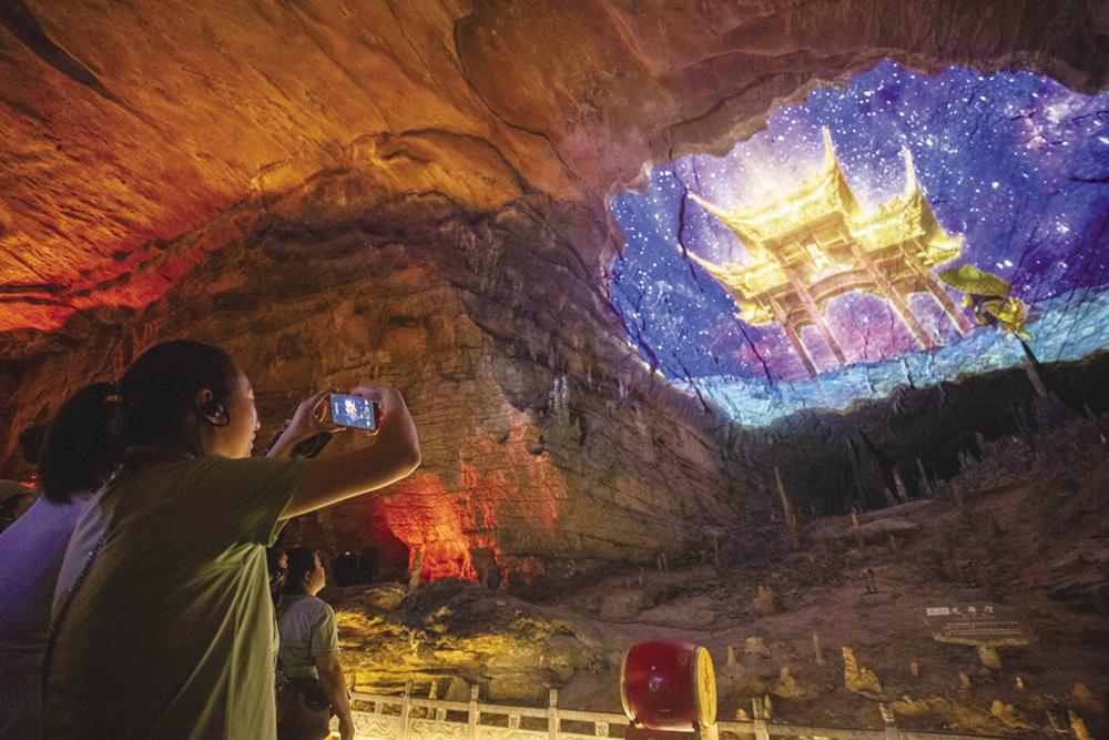 5月20日,游客在张家界黄龙洞景区游览拍照。 当日,湖南张家界黄龙洞景区灯光升级工程正式竣工亮相。此次灯光升级改造以“洞天福地”为主题,以“大鲵化龙”故事为引线,把天然石壁当成巨幕,将光影科技、神话故事和自然景色融为一体,为游客们打造了一场关于光影、神话与自然的奇幻之旅。 黄龙洞景区是湖南省张家界市著名的溶洞旅游景区,总面积10万平方米,洞内石笋、石柱、钟乳石等千奇百态、美不胜收。新华社记者 陈思汗 摄