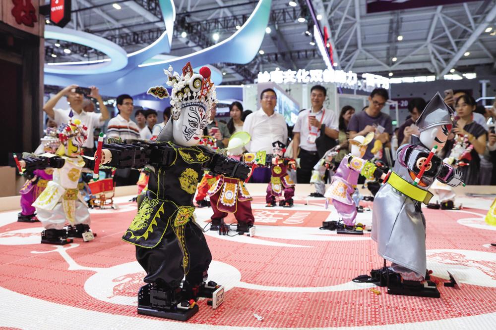 5月22日,观众在文博会汕头展台观看机器人表演英歌舞。 当日,为期5天的第二十一届中国(深圳)国际文化产业博览交易会在深圳国际会展中心开幕。本届文博会共设8大展馆,包括3个综合馆和5个专业馆,共有6280家政府组团、文化机构和企业线上线下参展,展出文化产品超过12万件,4000多个文化产业投融资项目将在现场进行展示与交易。新华社记者 梁旭 摄