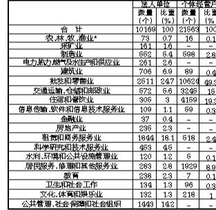 注:表中农、林、牧、渔业仅包括从事农、林、牧、渔专业及辅助性活动的法人单位与个体经营户,以及兼营第二、三产业活动的农、林、牧、渔业法人单位。表中房地产业包括房地产开发经营、物业管理、房地产中介服务、房地产租赁经营和其他房地产业。