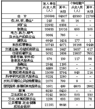 在第二产业和第三产业法人单位中,位居前三位的行业是:批发和零售业2511个,占24.7%;租赁和商务服务业1844个,占18.1%;公共管理、社会保障和社会组织1443个,占14.2%。在个体经营户中,位居前三位的行业是:批发和零售业10624个,占49.3%;住宿和餐饮业4159个,占19.3%;交通运输、仓储和邮政业3245个,占15.0%(详见表2-2)。