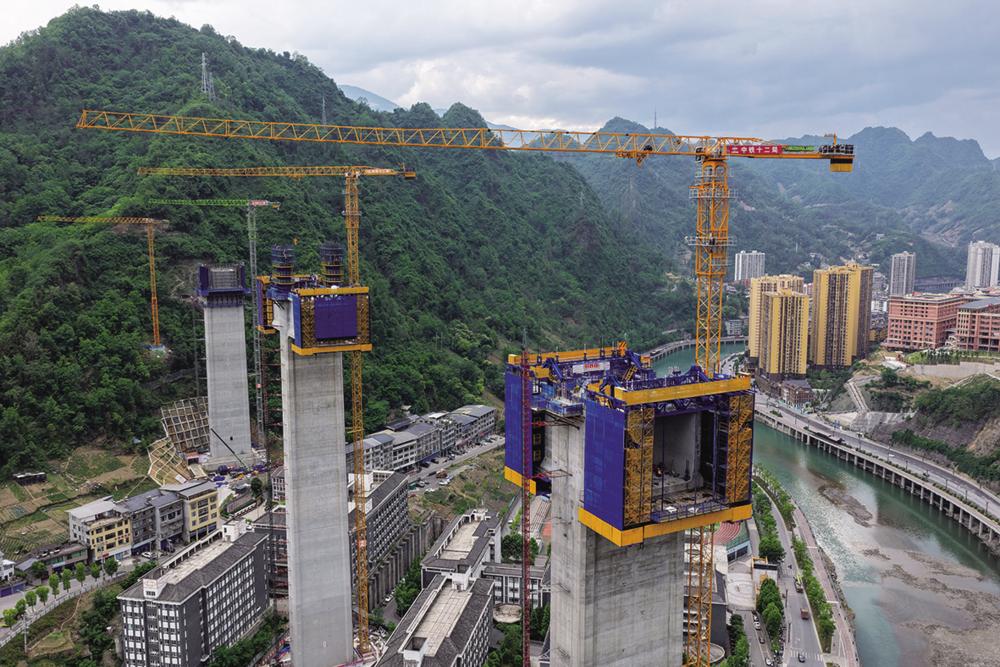 这是5月26日拍摄的西渝高铁任河特大桥建设现场(无人机照片)。 5月26日,随着最后一方混凝土浇筑,由中铁十二局承建的西渝高铁城口任河特大桥主桥墩施工顺利完成,标志着大桥进入梁部施工阶段,为全线通车奠定了坚实基础。 西渝高铁城口任河特大桥位于重庆市城口县境内,全长1180.52米,共有墩台19个,最大墩高132米,为西渝高铁康渝段重难点工程。 西渝高铁是全国“八纵八横”高速铁路通道之包(银)海、京昆通道重要组成部分,全长739公里,设计时速350公里。新华社记者 唐奕 摄