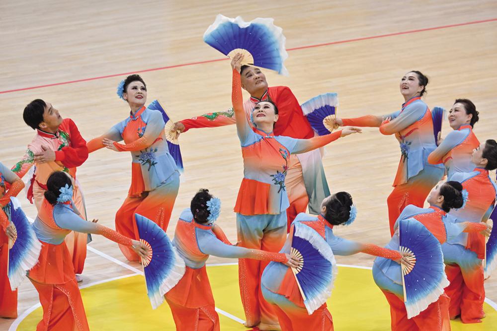 5月27日,山东省老年人体育协会代表队在比赛中。 当日,2025年全国老年人健身秧歌交流活动规定项目比赛在新疆维吾尔自治区奎屯市体育馆完赛。 新华社记者 徐宏岩 摄