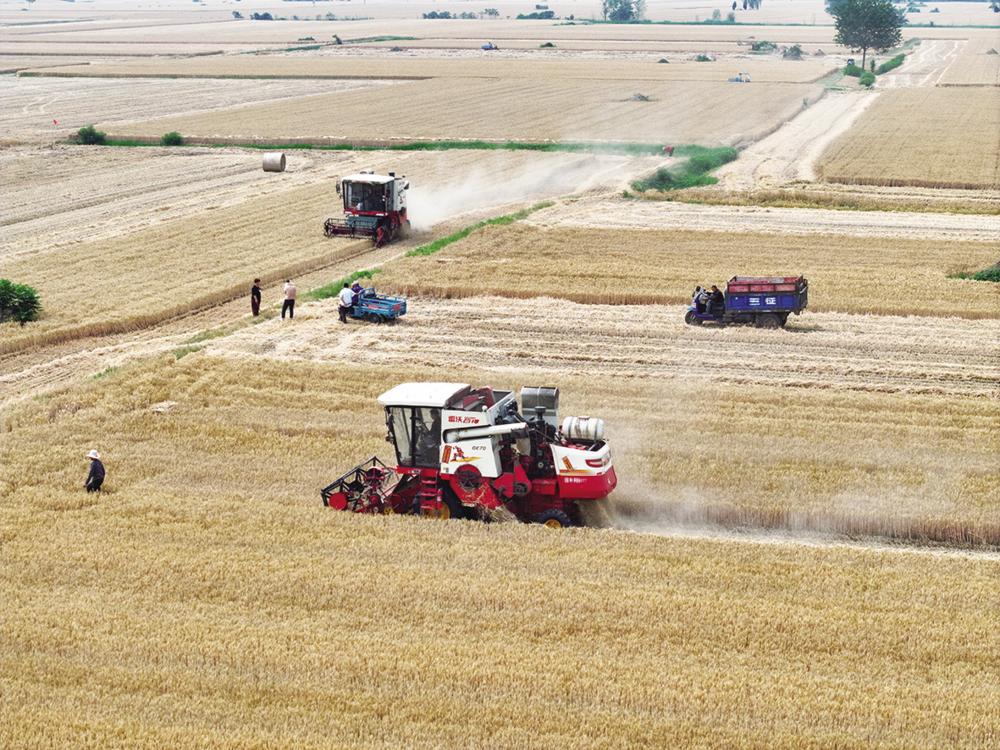 5月27日,在安徽省亳州市蒙城县小辛集乡麦田,农民利用收割机抢收小麦(无人机照片)。 记者从农业农村部了解到,截至5月26日17时,各地已收夏粮小麦7005万亩,日机收面积连续3天超过400万亩,全国“三夏”大规模小麦机收全面展开。新华社发(胡卫国 摄)