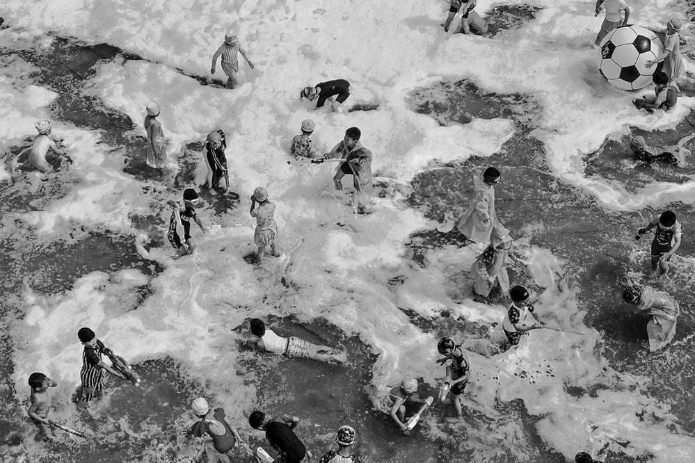 5月30日,在江苏省海安市高新区实验幼儿园,小朋友在泳池中玩耍(无人机照片)。 “六一”国际儿童节临近,孩子们在丰富多彩的活动中迎接属于自己的节日。 新华社发(顾彬斌 摄)