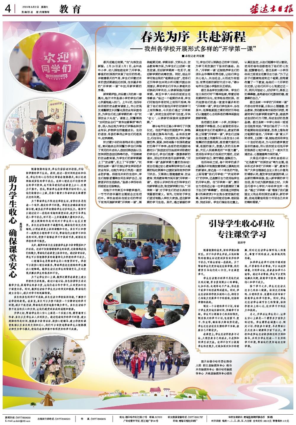 春风送暖归有期,“龙”光焕发启新程。2月29日至3月1日,全州各中小学、幼儿园陆续迎来了开学季,静谧的校园再次恢复了往日的热闹。伴随着春天的气息,学生们怀着对未来的美好期望回归校园,在丰富多彩的“开学第一课”中拉开新学期的序幕。