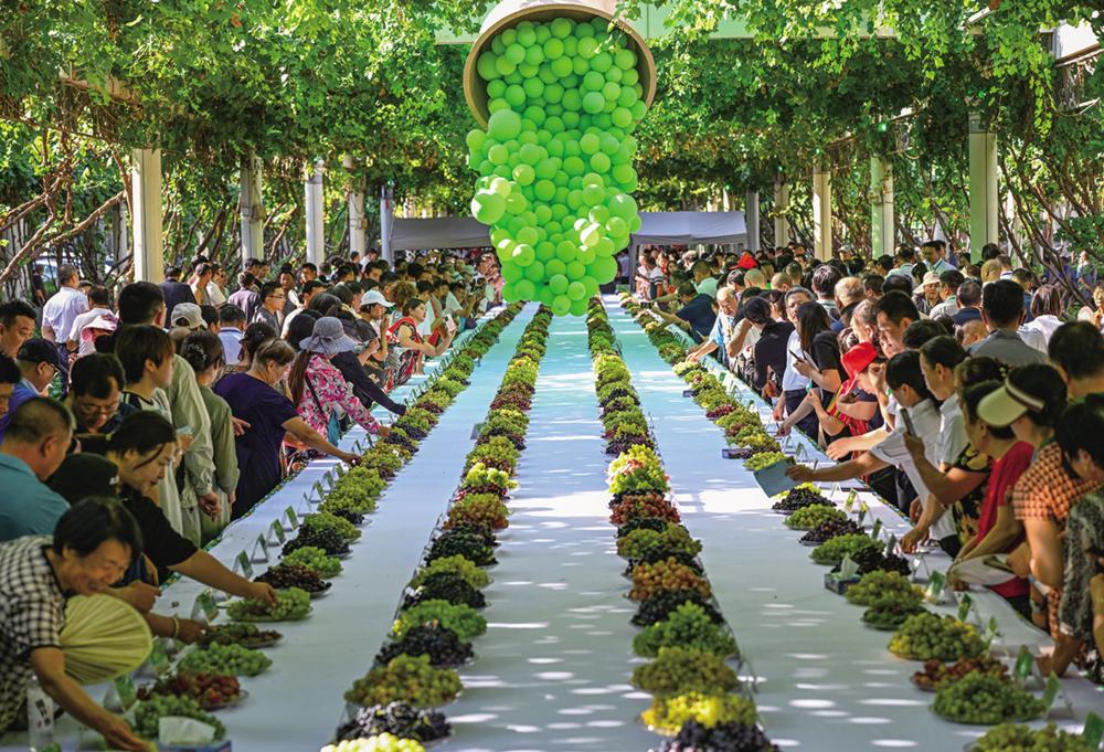 8月17日,人们在吐鲁番特色葡萄集市上品尝葡萄。 8月16日至18日,第三十届中国丝绸之路吐鲁番葡萄节在新疆吐鲁番市举行。本届葡萄节以“吐鲁番的葡萄熟了”为主题,邀请国内外宾客品尝葡萄及其制品,感受吐鲁番独特的葡萄文化与丝路魅力。 吐鲁番地处“黄金纬度”的葡萄种植带,现有葡萄种植面积63万亩、品种550个,是全国葡萄种植面积最大的地区。在当地形成了鲜食、制干、酿酒及葡萄枝、叶、副产物加工利用等全产业链条,融合发展葡萄酒庄游、乡村风情游、夜品葡萄沟等特色文旅品牌,葡萄产业已成为吐鲁番的“金色名片”。 新华社记者 陈 朔 摄