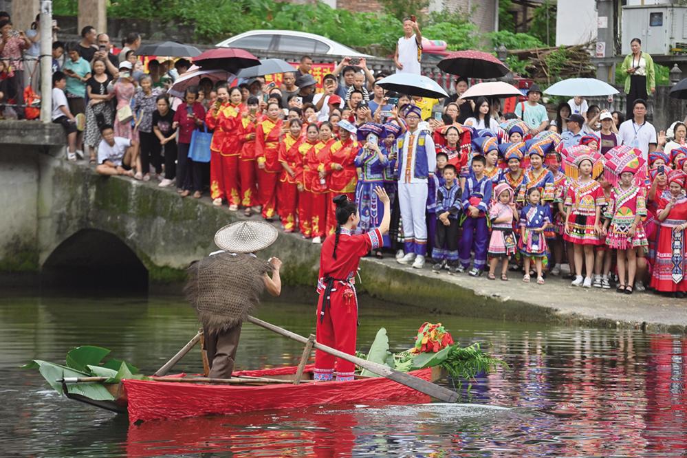 8月18日,在柳州市融水苗族自治县汪洞乡,村民们在改造后的河道上进行“刘三姐河上实景演出”。 近年来,广西柳州市融水苗族自治县汪洞乡在结对帮扶的广东省廉江市相关部门的支持下,充分利用水资源丰富的优势,举办水上竞技比赛、山歌对唱活动、非遗文化进校园等,擦亮“水文化”品牌,推进民族文化旅游产业发展,助力乡村振兴。 新华社记者 黄孝邦 摄