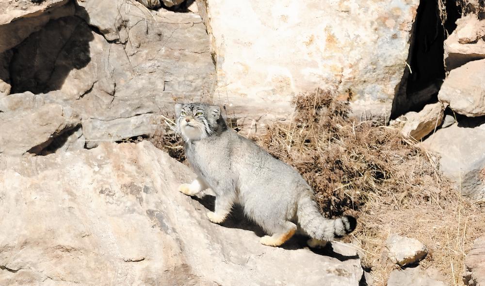 3月26日,记者在都兰县沟里乡境内采访时,山间偶遇一只呆萌兔狲,并用镜头记录下兔狲在山上的生活瞬间。从疾驰奔跑的活力四射,到晒太阳的悠然自得;从警觉张望的敏锐眼神,到岩石旁躲藏的隐秘身影,每一个瞬间都展现出兔狲独特的魅力与大自然的和谐共生。