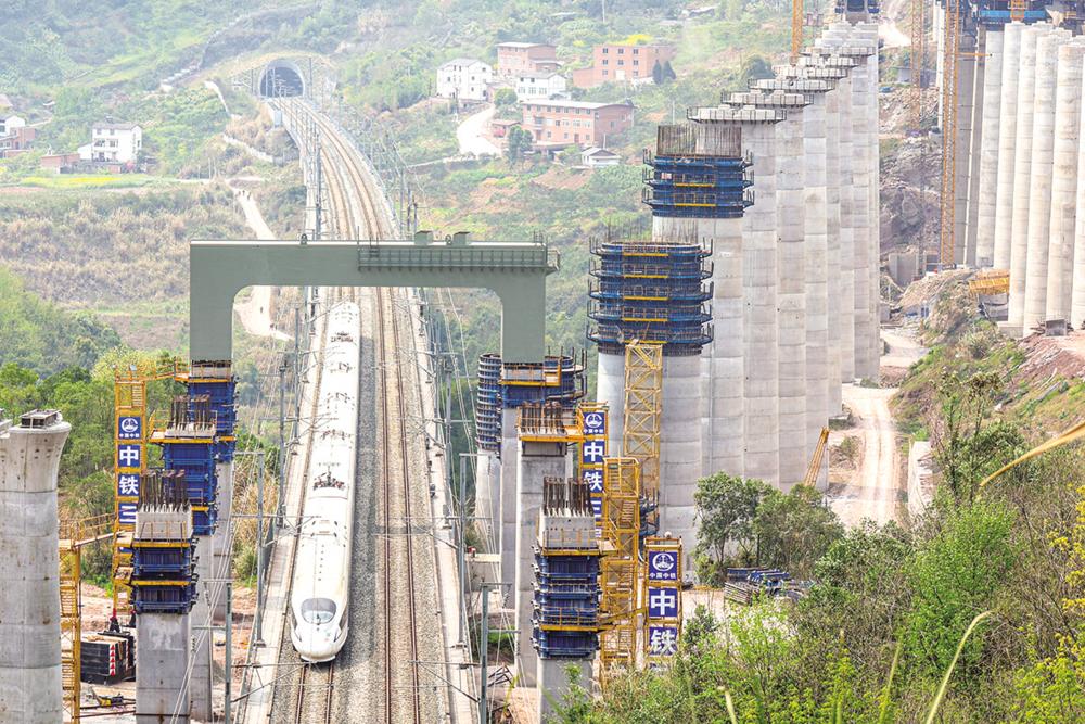 3月27日,郑渝高铁线上一列动车从门式墩钢横梁下通过。 3月27日凌晨,在中铁三局承建的成达万高铁左线福寿跨渝万城际特大桥项目施工现场,一榀重达165.8吨的门式墩钢横梁稳稳落在支座上,标志着成达万高铁首个跨既有高铁钢横梁吊装完成,也是三峡库区首次跨既有铁路线施工作业的成功案例,为后续桥梁架设奠定关键基础。 成达万高铁建成后,将形成成都直达中原和京津冀地区的便捷客运通道,极大便利沿线人民群众出行,促进沿线经济社会发展,对助力成渝地区双城经济圈建设、长江经济带等国家战略实施,具有重要意义。 新华社发(黄茂程 摄)