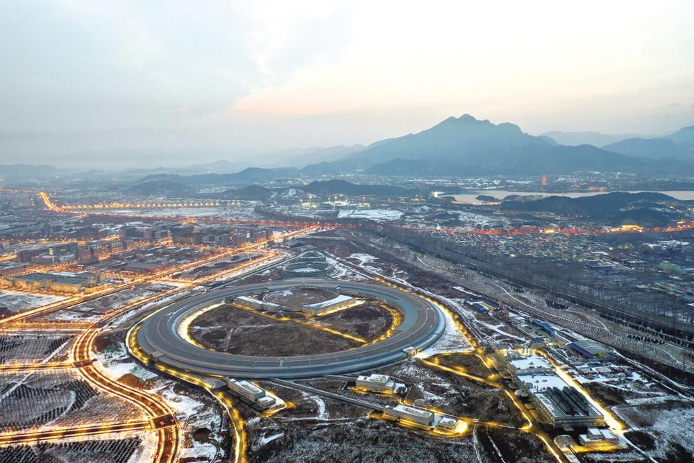 高能同步辐射光源(HEPS)全景(无人机照片,2023年12月11日摄)。 记者从中国科学院获悉,国家重大科技基础设施——高能同步辐射光源(HEPS)3月27日正式启动带光联调,HEPS建设进入冲刺阶段。 作为北京怀柔科学城重大科技基础设施集群的核心设施,HEPS由国家发展改革委批复立项,中国科学院高能物理研究所承担建设,建成后将是世界上设计亮度最高的第四代同步辐射光源之一,将为先进材料、航空航天、生物医药等领域前沿研究提供有力支撑。新华社记者 金立旺 摄