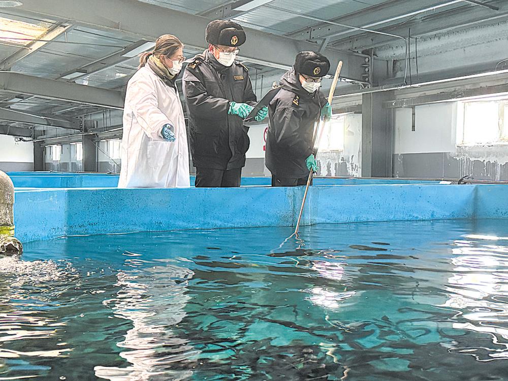 西宁海关所属西海海关关员对出口虹鳟鱼开展监管作业。西宁海关供图