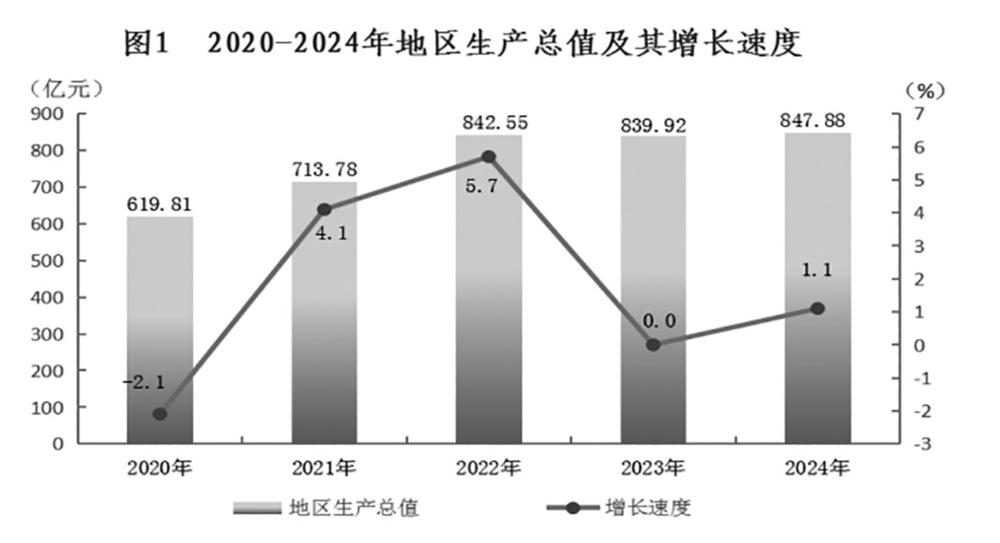 根据地区生产总值统一核算结果,全年全州生产总值^[2]847.88亿元,按不变价格计算,同比增长1.1%。分产业看,第一产业增加值49.63亿元,同比增长4.8%;第二产业增加值569.15亿元,同比下降0.2%;第三产业增加值229.1亿元,同比增长3.3%。三次产业比重为5.9:67.1:27。人均生产总值179598元,同比增长0.6%。